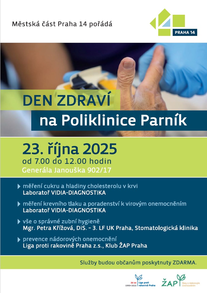 Již po X-té, ani si nepamatujeme po kolikáté doopravdy, pro Vás pořádáme ve spolupráci s městskou částí Prahy 14 Den zdraví v Poliklinice Parník na Černém Mostě v Praze 14.